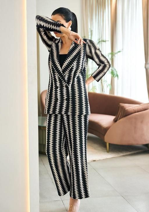 Name: Women Comfortable Fancy Zig Zag Design Co ord Set | Casual Top and Bottom Set for Women and Girls Top Fabric: Polyester Bottom Fabric: Wool Sleeve Length: Long Sleeves Net Quantity (N): 1 Sizes: S (Top Bust Size: 34 in, Top Length Size: 22 in, Top Hip Size: 34 in, Bottom Waist Size: 28 in, Bottom Hip Size: 28 in, Bottom Length Size: 38 in) M (Top Bust Size: 36 in, Top Length Size: 22 in, Top Hip Size: 36 in, Bottom Waist Size: 30 in, Bottom Hip Size: 30 in, Bottom Length Size: 38 in) L (Top Bust Size: 38 in, Top Length Size: 22 in, Top Hip Size: 38 in, Bottom Waist Size: 32 in, Bottom Hip Size: 32 in, Bottom Length Size: 40 in) XL (Top Bust Size: 40 in, Top Length Size: 22 in, Top Hip Size: 40 in, Bottom Waist Size: 34 in, Bottom Hip Size: 34 in, Bottom Length Size: 40 in) XXL Introducing the Women Comfortable Fancy Zig Zag Design Coat Pant Set, a versatile ensemble designed to elevate your casual and semi-formal. This premium ensemble is crafted from the finest woolen fabric, featuring intricate black and white crochet lace design. The set includes a stylish V-neck jacket and matching palazzo pants, both showcasing the exquisite zigzag pattern.The sleeveless jacket adds a modern touch to this elegantt outfit.Perfect for various occasions, whether you're out for a casual gathering or attending a semi-formal event, this set offers effortless style and sophistication. Embrace your inner cowgirl with our high-quality Western Wear line. These clothes are built to withstand the rigors of ranch life while keeping you looking fabulous. Slip into our Western Wear, and you'll feel confident, comfortable, and ready to take on any adventure. Whether you're a seasoned ranch hand or just love the Western aesthetic, our women's Western Wear collection has something for you. Elevate your everydayy style with pieces that infuse your look with a touch of ruggedd charm. From trail rides to line dancing, these clothes will have you strutting in style wherever the open road takes you. Country of Origin: India