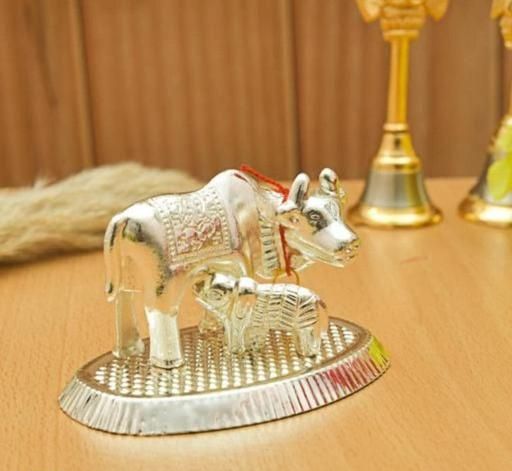 K.Y. Collections Presents Silver Kamdhenu Cow With Calf For Home Decor. The epitome of motherly love, this Kamdhenu cow of the gow feeding its baby is the symbol of true motherly love and affection. The metal figure is placed on a base. Beautiful creation of Kamdhenu cow and calf is a perfect symbol of the undying aura of the holy saint that encompasses numerous devotees round the globe. This statue conveys the emotion who consider cow(gomatha) as a mother figure.