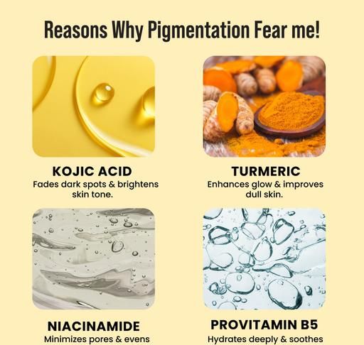 Dark spots and pigmentation? They fear me! Powered by Kojic Acid, Turmeric, and Niacinamide, I’m here to make you glow and look flawless. My non-drying formula suits everyone, even the picky ones