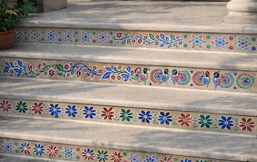A Kolam is a geometrical line drawing composed of curved loops, drawn around a grid pattern of dots. In South India, it is widely practiced art form. These designs are passed from one generation to the other. Kolams are thought to bring prosperity to <warning name='Holme's'>homes</warning>. In olden days, kolams were drawn in coarse rice flour, so the ants would not have to walk too far or too long for a meal. The rice powder also invited birds and other small creatures to eat it, thus welcoming other beings into one's home and everyday life: a daily tribute to harmonious co-existence.