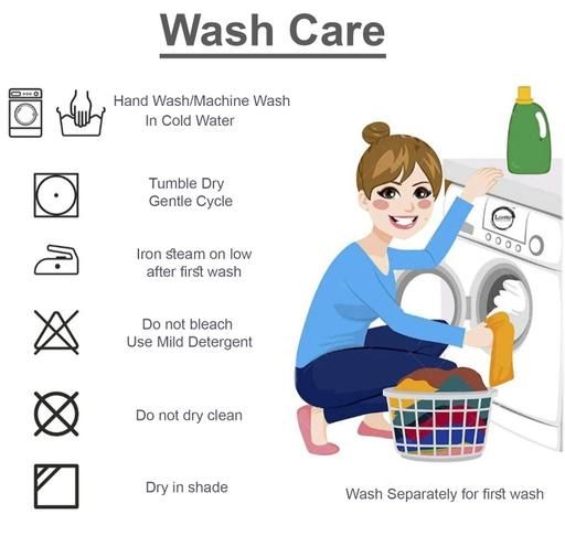 Wash Care: Hand Wash In Cold Water, Do not Brush or Bleach. Dry in Shade. Special Wash Tip: For First wash, put one teaspoon salt into water, Wash Separately for First Few Wash.
