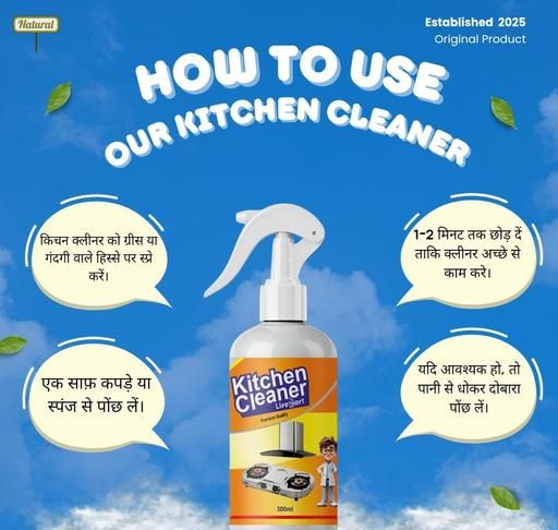 Name: KITCHEN OIL & GREASE STAIN CLEANING REMOVER SPRAY Kitchen Degreaser Cleaner Non Corrosive Multipurpose Product - Removes Oil Grease Food Stains, Chimney Stove Grill, Kitchen Slab, Tiles, Floor, Sink Cleaner Liquid PH Neutral Kitchen Cleaner Spray Chimney Cleaner Bathroom Cleaner- 300ml