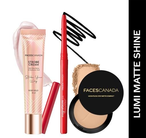 Product Name: FACES CANADA Lumi Matte Shine Combo - Strobe Cream - Rose Gold (18 ml) + Magneteyes Kajal - Black (0.35 gm) + Weightless Stay Matte Compact Powder - Beige 03 (9 gm) | Flawless Glowy Finish | Hides Imperfections