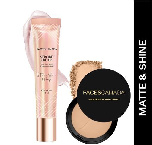 Product Name: FACES CANADA Matte & Shine Combo - Strobe Cream - Rose Gold (18 ml) + Weightless Stay Matte Compact Powder - Beige 03 (9 gm) | Flawless Glowy Finish | Hides Imperfections