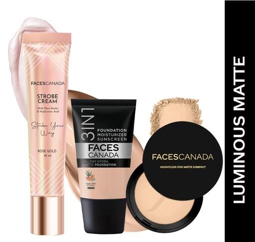 Product Name: FACES CANADA Luminous Matte Combo - Strobe Cream - Rose Gold (18 ml) + Weightless Stay Matte Compact Powder - Natural 02 (9 gm) + Hydra Matte Foundation - Rose 011 (18 ml) | Illuminating & Glowing Makeup Base | 10HR Long Wear
