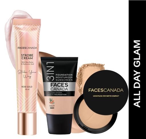 Product Name: FACES CANADA All Day Glam Combo - Strobe Cream - Rose Gold (18 ml) + Weightless Stay Matte Compact Powder - Beige 03 (9 gm) - Hydra Matte Foundation - Rose 011 (18 ml) | Illuminating & Glowing Makeup Base | 10HR Long Wear