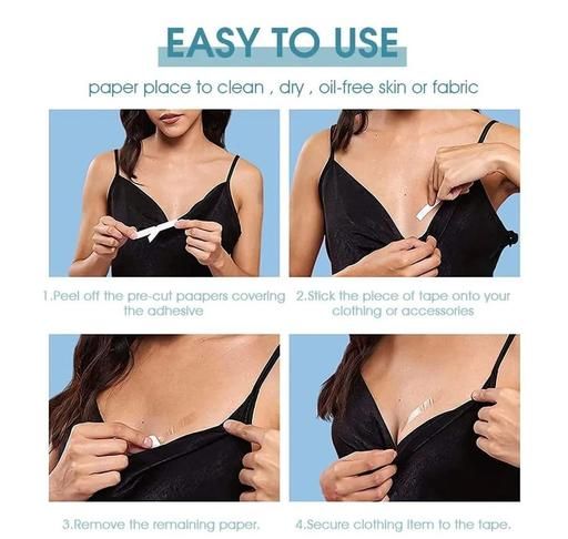 - KEEP CLOTHES STEADY : double-sided tape will keep your clothes and skirt hemlines closer to your undergarments and skin, which can shape all your outfits(including clothes styles of V-Necks, backless, strapless dresses, hidden bra straps and more)to keep them refined, classy and elegant all day long without embarrassing slips, visible straps or sagging necklines.