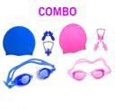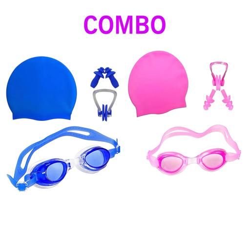 Swim kit combo of 2 sets of swimming cap, goggles and ear-nose plugs. One pink combo and One blue combo. Swimming caps. Swimming goggles. Swimming ear plug and nose plug. Goggles give underwater visibility.