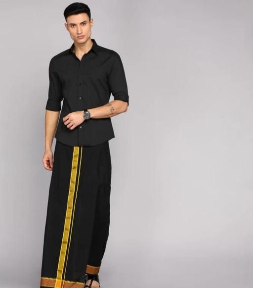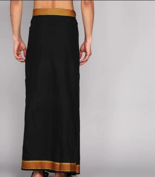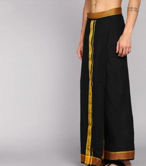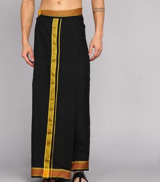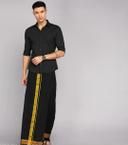 Name: Classic Black Pure Cotton Dhoti for Men with Intricate Gold Zari Temple Border and Vertical Stripes