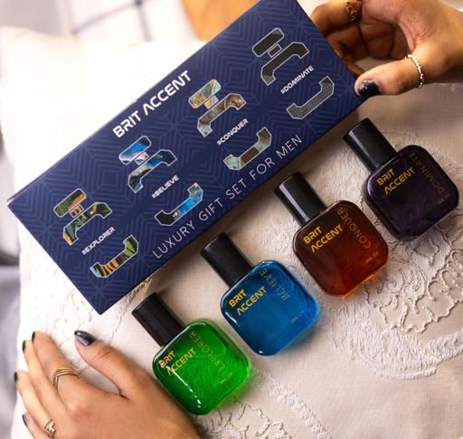 The BRIT ACCENT Luxury Gift Set for Men is a premium collection of four distinct Eau de Parfum fragrances, each in a 20 ML bottle, totaling 80 ML. Designed for the modern man, this set includes Believe, Conquer, Dominate, and Explorer, crafted with high-quality ingredients to deliver long-lasting, sophisticated scents. Inspired by British elegance, each fragrance offers a unique blend of notes, perfect for various occasions—whether it's making a bold statement or exuding subtle confidence. This luxurious pack is an ideal gift, combining character, style, and versatility in a compact, travel-friendly size.