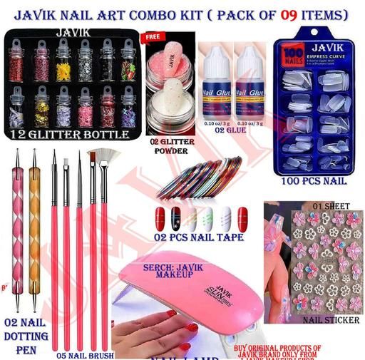 Product Name: Nail Art Kit Combo Glitter 12 + Nails 100 + Glue 02 + Dotting Pen 2 + Nail Art Brush 5 + Lamp 1 + Glitter Powder 2