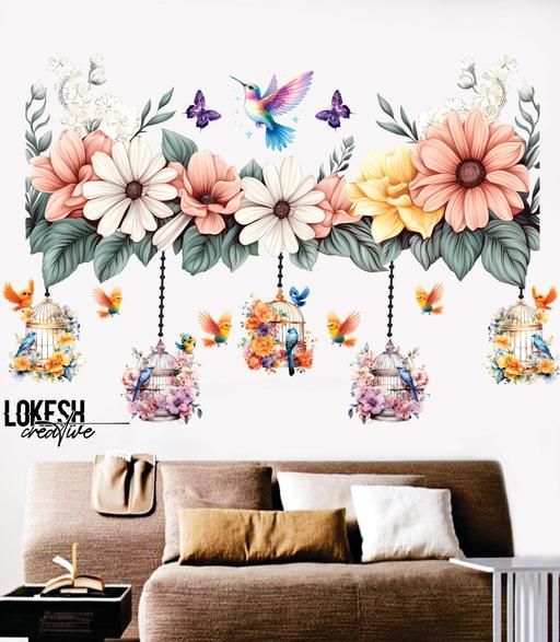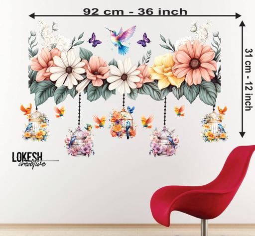Name: Floral Wall Decal with Birdcages and Hummingbird Design, 92 cm x 31 cm, Decorative Vinyl Wall Sticker
