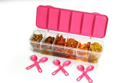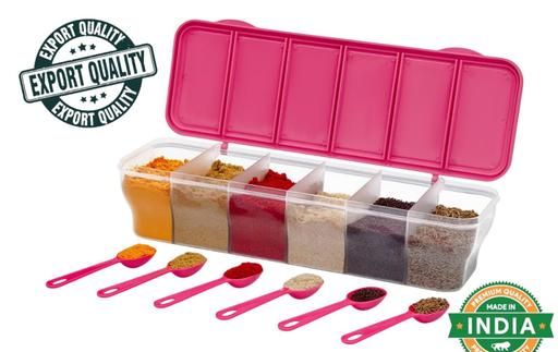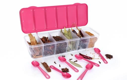 Name: 6-in-1 Masala Box for Kitchen, Airtight BPA-Free Plastic 6 Section Storage Container with 6 Spoons, 1800 ml Transparent Pickle Box for Spices, Dry Fruits, Snack (Pack of 1) (pink)
