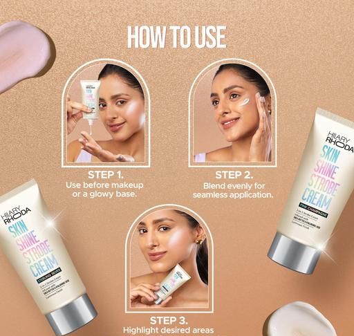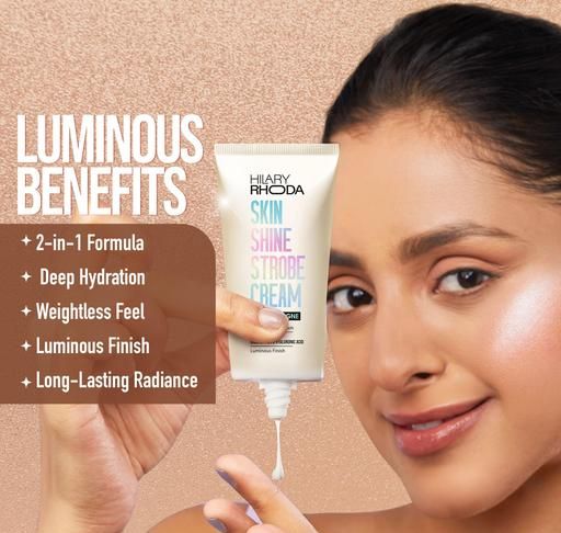 2 in 1 Cream: Hilary Rhoda's Skin Shine Strobe Cream, acts as both a moisturiser and a subtle highlighting boost, simplifying your beauty routine for a flawless base. Use Hilary Rhoda's Skin Shine Strobe Cream alone for a natural shine, or mix it with foundation for an amplified, lit-from-within effect.