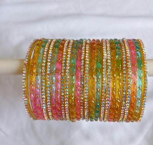 Mix of Gally stone bangles, glass bangles, and golden Rain dropp work