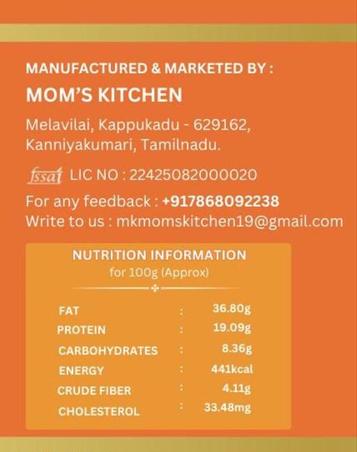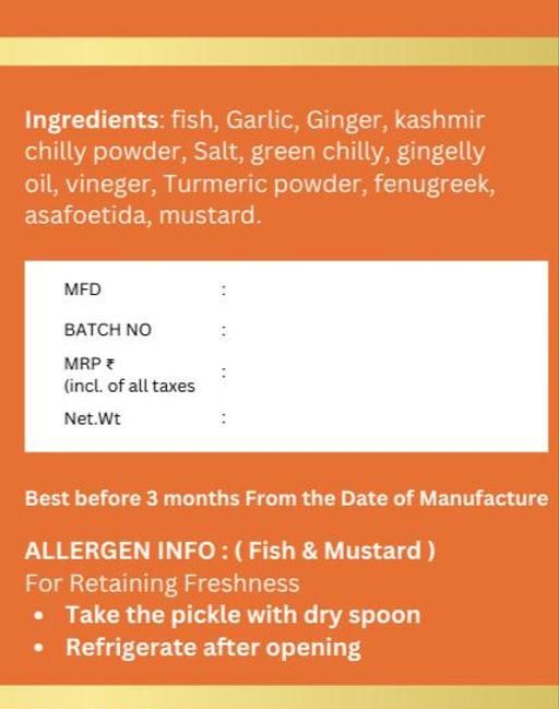 MOMS KITCHEN TUNA fish pickle can be tasty and healthy.Its made with high quality ingredients.This pickle usually made by frying small pices of fish and mixed with ginger garlic paste and other spices.Ingredients:fish,garlic,ginger,kashmir chilly powder,salt,green chilly,gingelly oil,vineger,turmeric powder,fenugreek,asafoetida,mustard.Away from direct sun light.Take the pickle with dry spoon.refrigerate after opening.Shelf life of 3 month from the date of manufacture.