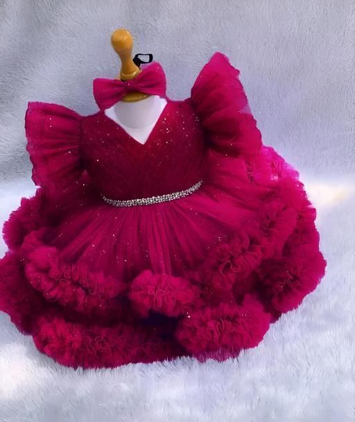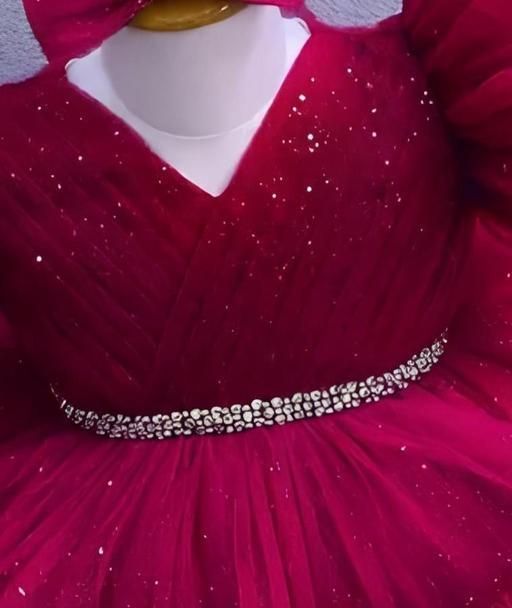 Girls Cute trendy Fashionable Stylish Sleeveless Net Party Frock & Dress | A-Line Silhouette, Layered Ruffle Skirt, Fitted Bodice, Above Knee, Puff Sleeve, V-Neck, A-Line, Tiered, Pull-on, Sequins, Rhinestones, Bow, Belted, Partywear, Party Frock, for Girls Pink, Magenta | party frock, A-line fit, above knee length, puff sleeve sleeves, V-neck neckline, embellished with sequins, rhinestones, bow, suitable for partywear, in dark pink/magenta glitter, comes with headband, belt