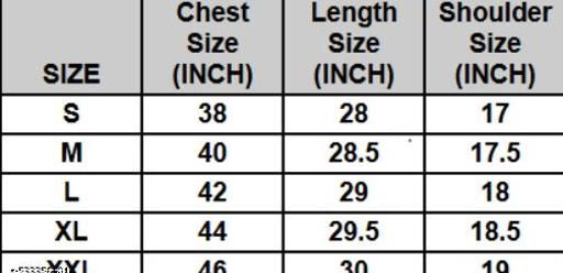 S (Chest Size: 38 in, Length Size: 28 in)