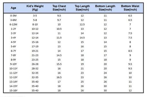 2-3 Years (Top Chest Size: 24 in, Top Length Size: 15.5 in, Bottom Waist Size: 19 in, Bottom Length Size: 13 in)