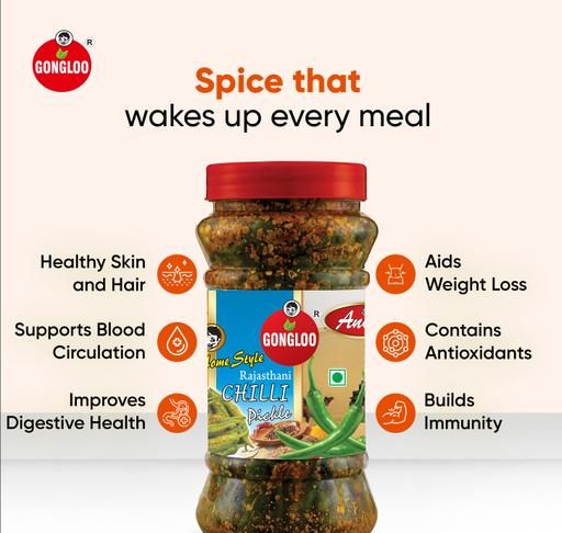 Our pickle is prepared using time-tested recipes, ensuring a preservative-free, natural product that brings the rustic charm of Rajasthani cuisine to your table. The careful use of less mustard oil makes it healthier without compromising on taste. Whether as a side or a condiment, Anand Green Chilli Pickle adds an irresistible zing and aroma to your dishes.