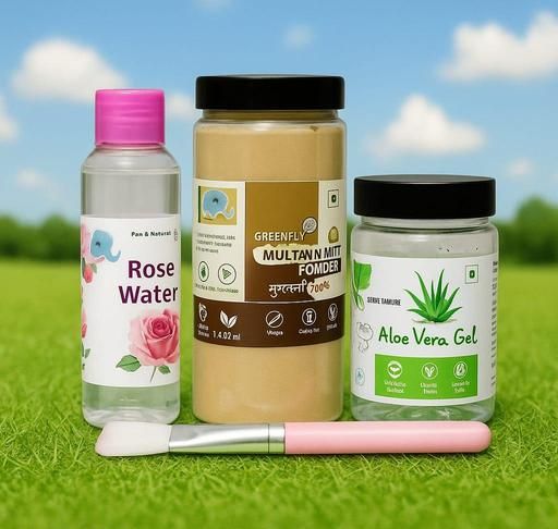 Product Name: Mitti Powder 100% Natural for Skin (200g), Rose Water (120ml), Brush & Aloe Vera Gel