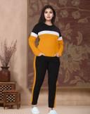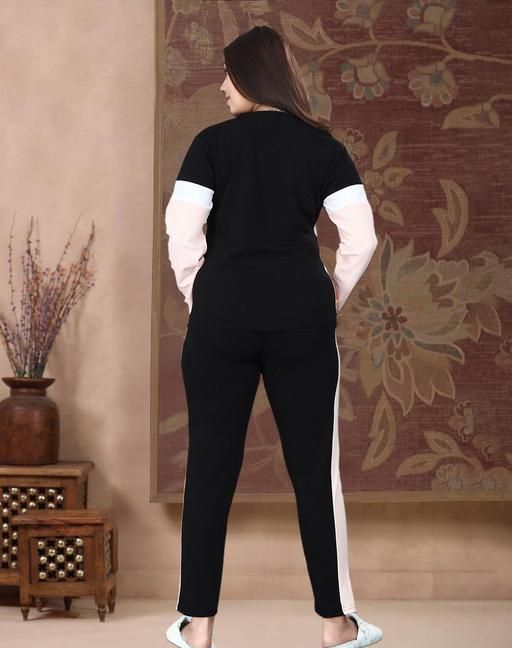 Name: Women's Colorblock Loungewear Set - Black, Peach & White Women's Cotton Track Suit Set with Round Neck Full Sleeve Straight Length Relagur Fit and Drawstring Closure Pant