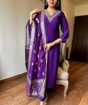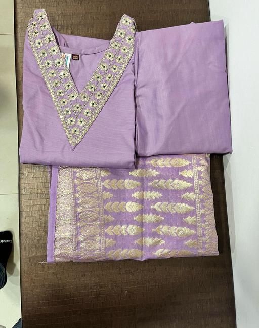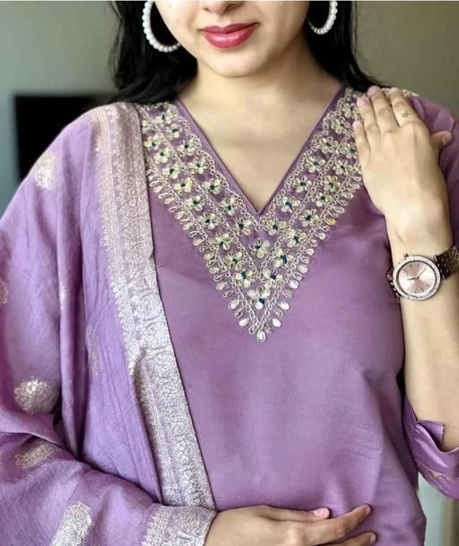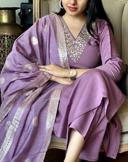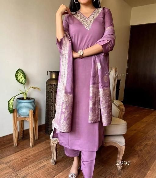 Name: Women's Lavender Colour Rayon Slub V-neck Embroidered Straight Kurta Pant with Dupatta sat