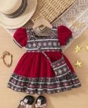 Name: 2pcs/Set Baby Girls Princess Style Square Collar Puff Sleeve Floral & Geometric Print Splicing Dress With Invisible Zipper For Matching Bag, Comfortable And Fashionable For Spring/Summer/Autumn