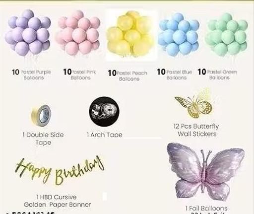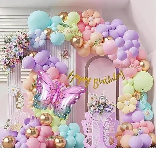 Name: Butterfly Theme Birthday Party Decorations with Pastel Balloons for Decoration, Foil Balloons for Decor, Butterfly Stickers for Wall Decoration, Birthday Decoration Kit for Girls