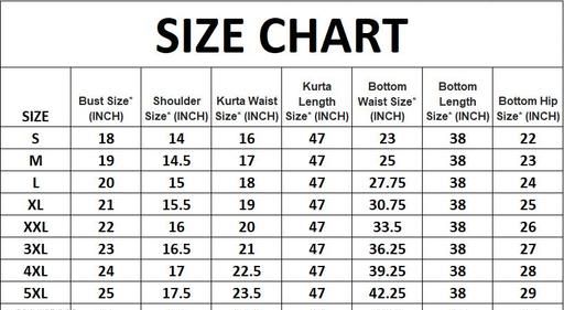 5XL (Bust Size: 25 in, Shoulder Size: 17 in, Kurta Length Size: 47 in, Kurta Hip Size: 28 in, Kurta Waist Size: 46 in, Bottom Waist Size: 42 in, Bottom Hip Size: 29 in, Bottom Length Size: 38 in)