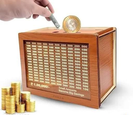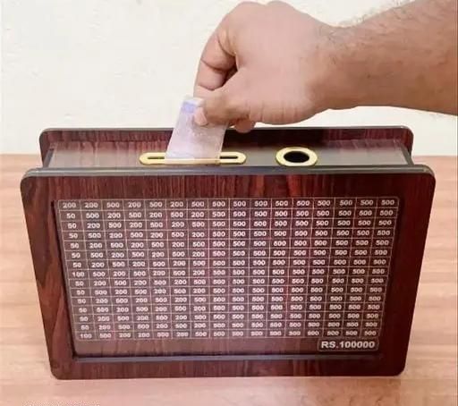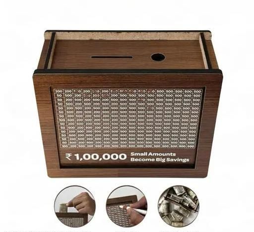 Name: Premium Wooden 1 Lakh Money Saving Box | Carved Piggy Bank with Tracker for Kids & Adults | ₹1,00,000 Challenge Smart Coin Box | Durable, Decorative Wooden Cash Vault for Home Savings