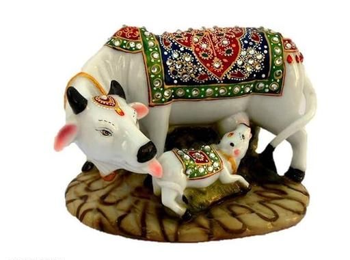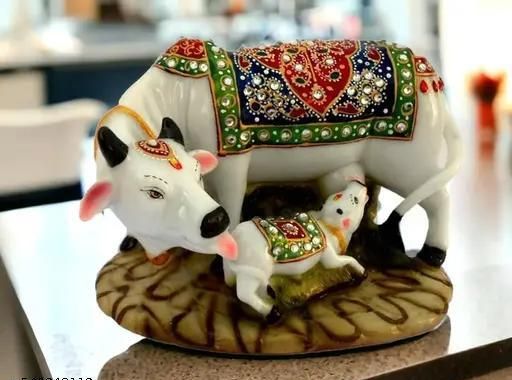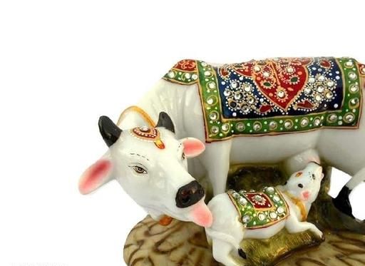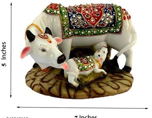 Name: Kamdhenu Cow and Calf Showpiece | Good Luck Gift | Handicraft Marble Dust/Polyresin Decorative Statue | 5x3x3 Inch | Export Quality