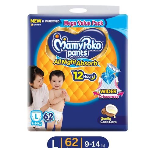 Product Name: MamyPoko Pants All Night Absorb Baby Diapers with Gentle Coco Care | Large (L) | 62 Count - (9-14 kg)