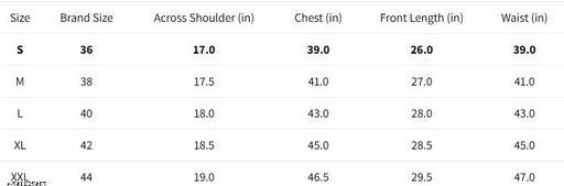 S (Chest Size: 39 in, Length Size: 26 in, Waist Size: 39 in, Shoulder Size: 17 in)
