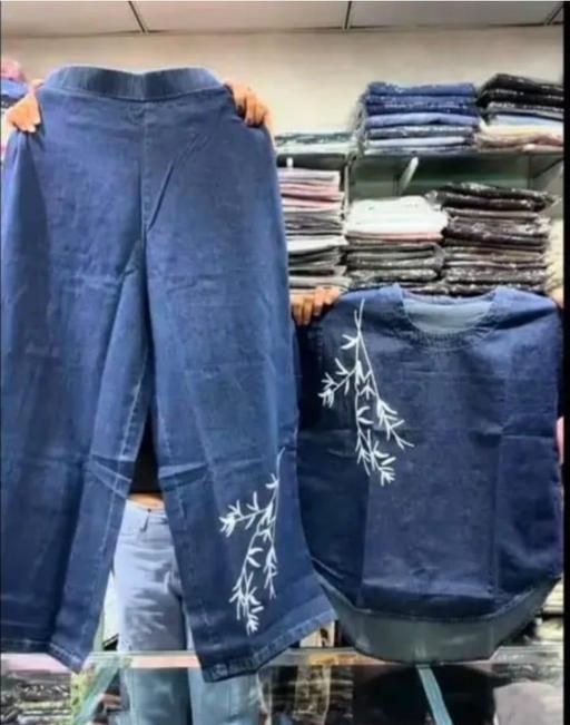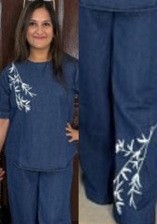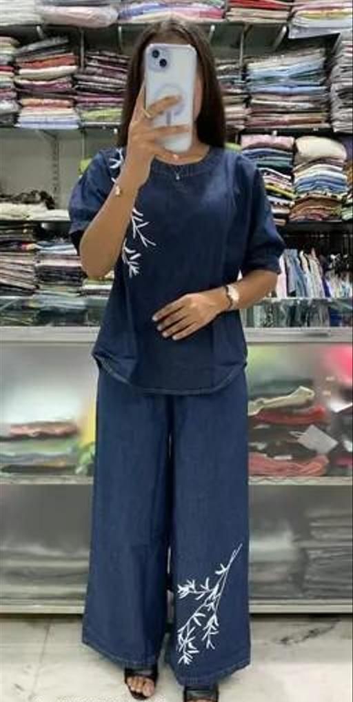 Name: Trendy Women's Denim Co-ord Set with Puff Sleeves & Embroidered Wide-Leg Pants – Casual Two-Piece Outfit