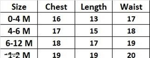 0-3 Months (Bust Size: 16 in, Waist Size: 17 in, Length Size: 13 in)