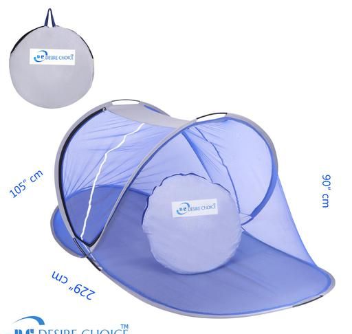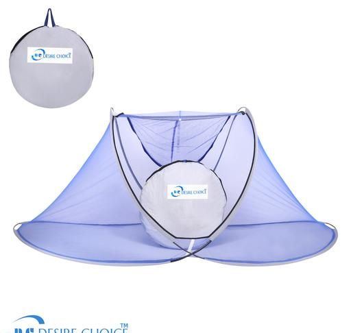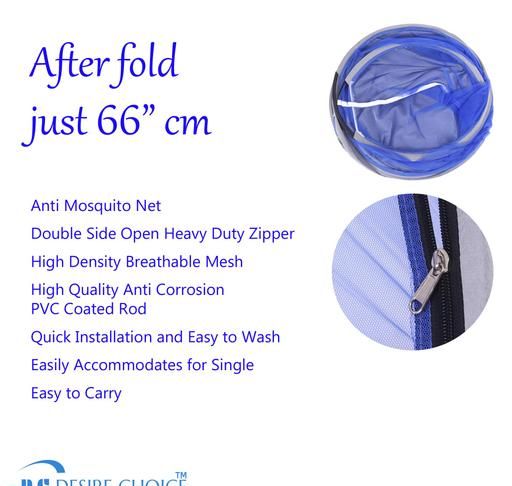 DESIRE CHOICE MOSQUITO NET Good for sleep Excellent for Meditation & Yoga Solid piping & double interlocking (in and out). Floor stops fleas, bed bugs, spiders & other crawling insects. The toughness of the steel, keeps the net in a perfect shape at all times. Zippered Door, for easy entrance. Large zippered side allows easy access. Fully polyester floor, polyester mesh netting to keep the smallest bugs away. EASILY PORTABLE: Going on vacation or work trip to a place with bees, spiders, mosquitoes, etc. DESIRE CHOICE Mosquito Net is foldable, so you can just take it on the go. The top hoop is steel that can be folded and unfolded multiple times without breaking, unlike nets plastic hoops. ADVANTAGES: Light weight Travel-friendly Easy to wash & maintain Soft and comfortable .Compact and foldable single bed size mosquito tent. Provides complete protection in natural and organic way to your kids. No scope for mosquitoes to enter. DIMENTION: OPEN: 105x 229x 90 CM | FOLDED: 60.5 x 60..5 x 3 cm | Weight - 1 kg |Color:-BLUE| Single Bed Mosquito Net With Base. You can use this on Floor or Bed PLEASE SEARCH ON YOU TUBE , HOW TO FOLD MOSQUITO NET
