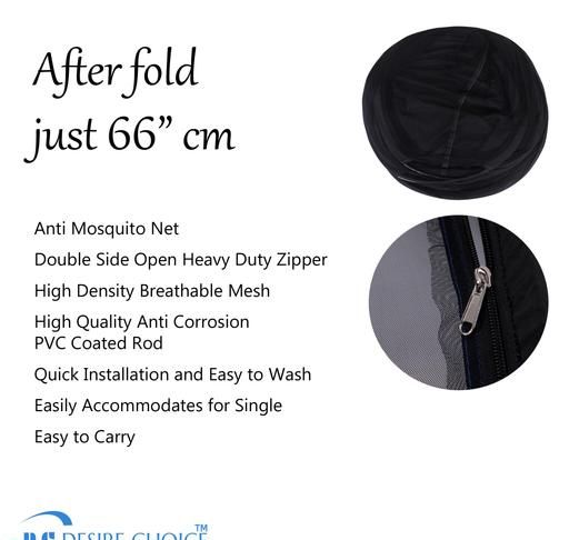 DESIRE CHOICE MOSQUITO NET Good for sleep Excellent for Meditation & Yoga Solid piping & double interlocking (in and out). Floor stops fleas, bed bugs, spiders & other crawling insects. The toughness of the steel, keeps the net in a perfect shape at all times. Zippered Door, for easy entrance. Large zippered side allows easy access. Fully polyester floor, polyester mesh netting to keep the smallest bugs away. EASILY PORTABLE: Going on vacation or work trip to a place with bees, spiders, mosquitoes, etc. DESIRE CHOICE Mosquito Net is foldable, so you can just take it on the go. The top hoop is steel that can be folded and unfolded multiple times without breaking, unlike nets plastic hoops. ADVANTAGES: Light weight Travel-friendly Easy to wash & maintain Soft and comfortable .Compact and foldable single bed size mosquito tent. Provides complete protection in natural and organic way to your kids. No scope for mosquitoes to enter. DIMENTION: OPEN: 105x 229x 90 CM | FOLDED: 60.5 x 60..5 x 3 cm | Weight - 1 kg |Color:-BLUE| Single Bed Mosquito Net With Base. You can use this on Floor or Bed PLEASE SEARCH ON YOU TUBE , HOW TO FOLD MOSQUITO NET