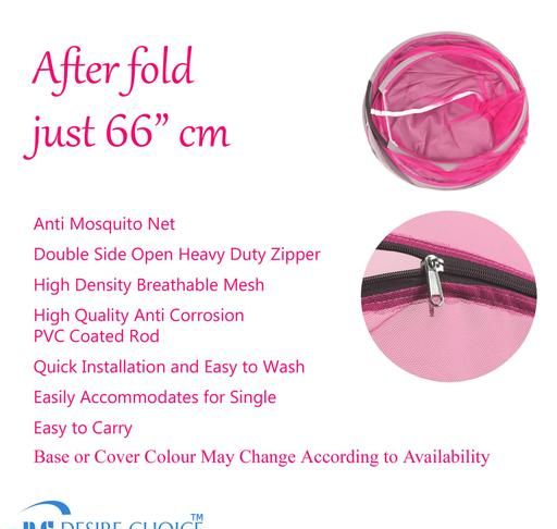 DESIRE CHOICE MOSQUITO NET Good for sleep Excellent for Meditation & Yoga Solid piping & double interlocking (in and out). Floor stops fleas, bed bugs, spiders & other crawling insects. The toughness of the steel, keeps the net in a perfect shape at all times. Zippered Door, for easy entrance. Large zippered side allows easy access. Fully polyester floor, polyester mesh netting to keep the smallest bugs away. EASILY PORTABLE: Going on vacation or work trip to a place with bees, spiders, mosquitoes, etc. DESIRE CHOICE Mosquito Net is foldable, so you can just take it on the go. The top hoop is steel that can be folded and unfolded multiple times without breaking, unlike nets plastic hoops. ADVANTAGES: Light weight Travel-friendly Easy to wash & maintain Soft and comfortable .Compact and foldable single bed size mosquito tent. Provides complete protection in natural and organic way to your kids. No scope for mosquitoes to enter. DIMENTION: OPEN: 105x 229x 90 CM | FOLDED: 60.5 x 60..5 x 3 cm | Weight - 1 kg |Color:-BLUE| Single Bed Mosquito Net With Base. You can use this on Floor or Bed PLEASE SEARCH ON YOU TUBE , HOW TO FOLD MOSQUITO NET