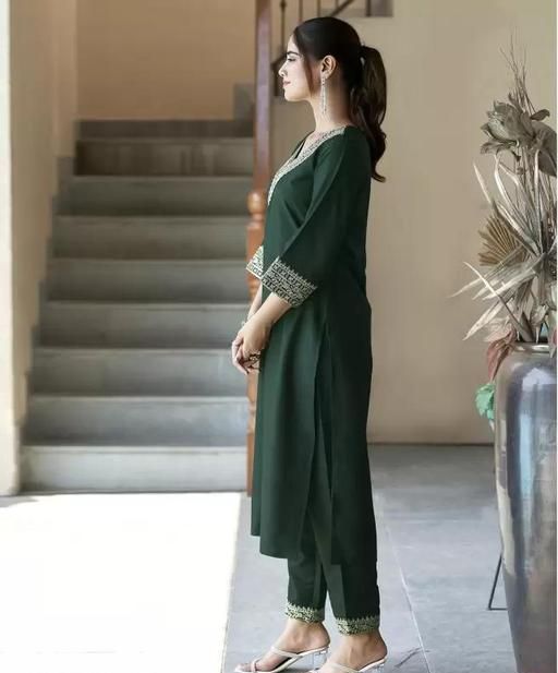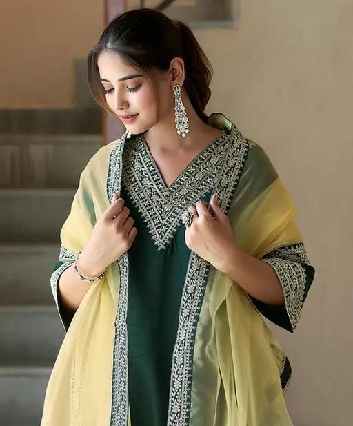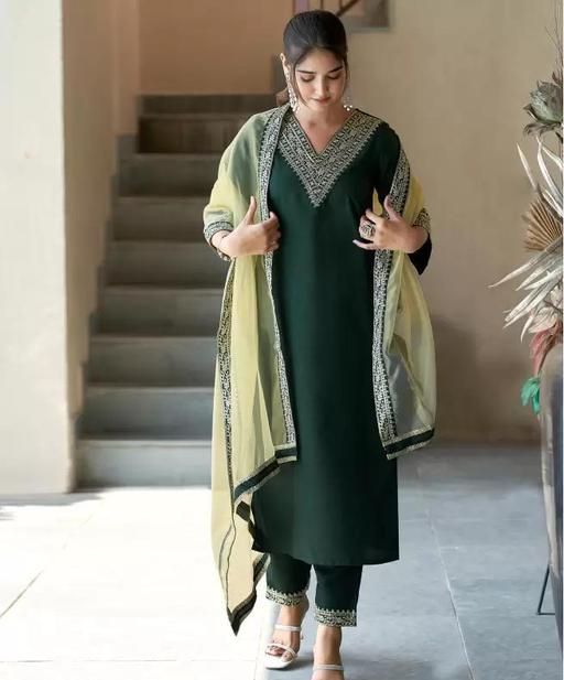 Name: Women's Trendy Fabulous Green V-Neck Embroidered Kurta Pant Dupatta Set