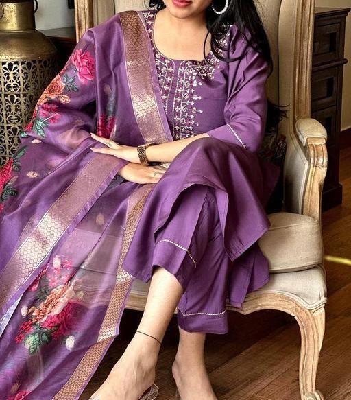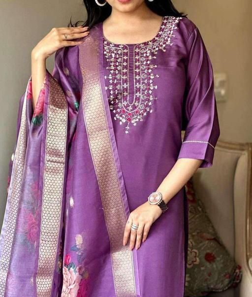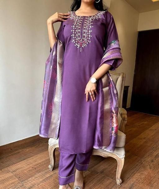 Name: Women's Attractive Purple Reyon Slub Embroidered Kurta Pant Dupatta Set