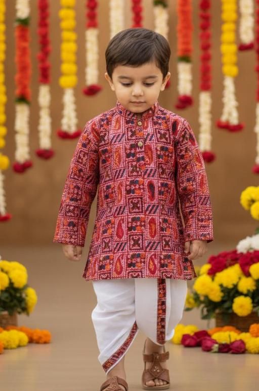 This ethnic clothing set for boys becomes the natural choice for baby boys during events deeply rooted in Indian culture. This can be a good choice as trendy kids dhoti kurta set for janamasthami or boys dhoti kurta for Navaratri as communities gather to celebrate , this printed kurta for boys is also goes well as annaprashan dhuti Panjabi set . For parents looking for a genuine touch of tradition in boys daily wear, this fancy dhoti kurta set for boys delivers authenticity rooted in Indian heritage, without ever compromising on ease or detail.