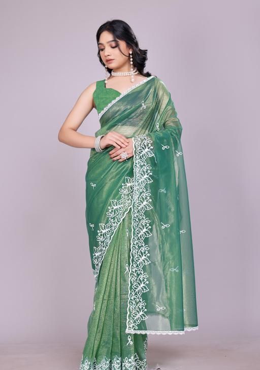 GOLD SINING TWO TONE SAREE WITH EMBROIDERED LACE BORDER WITH WORK BLOUSE