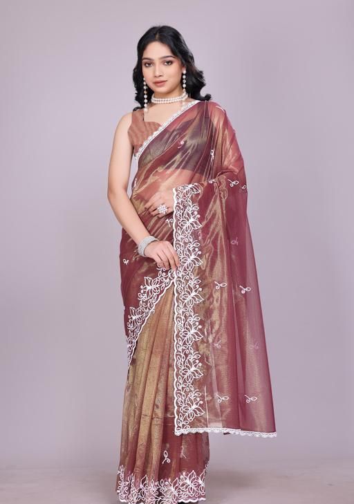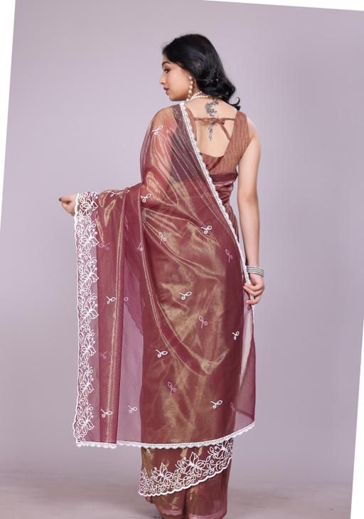GOLD SINING TWO TONE SAREE WITH EMBROIDERED LACE BORDER WITH WORK BLOUSE