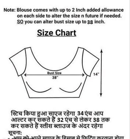 Please alter the blouse for best fitting blouse /size stitched is 17-18bust /extra margin available inside / max 20 bust can wear the same / easily alterable blouse for best fit