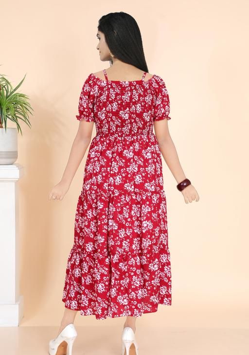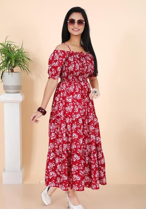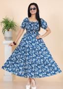 Look effortlessly stylish in this floral printed maxi dress for women. Featuring a smocked bodice, puff sleeves, it offers both comfort and charm. Perfect for casual outings,long frock for women,birthday party wear,ocation,parties brunches, vacations, or festive wear.