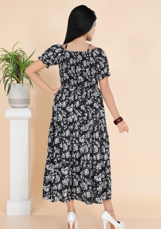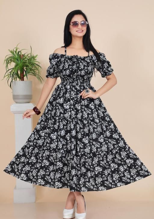 Look effortlessly stylish in this floral printed maxi dress for women. Featuring a smocked bodice, puff sleeves, it offers both comfort and charm. Perfect for casual outings,long frock for women,birthday party wear,ocation,parties brunches, vacations, or festive wear.