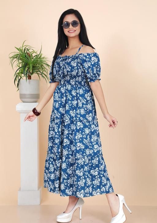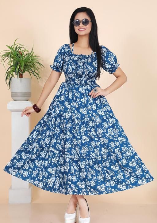 Look effortlessly stylish in this floral printed maxi dress for women. Featuring a smocked bodice, puff sleeves, it offers both comfort and charm. Perfect for casual outings,long frock for women,birthday party wear,ocation,parties brunches, vacations, or festive wear.