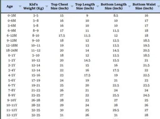 2-3 Years (Top Chest Size: 21 in, Top Length Size: 15 in, Bottom Waist Size: 21 in, Bottom Length Size: 15 in)
