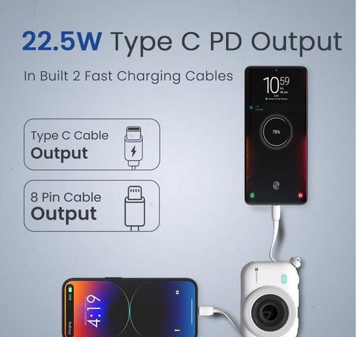 The Portronics Power Shutter Wireless Magnetic Power Bank is an innovative, high-capacity 10000mAh power solution designed for those who need reliable charging on the go. With its impressive 22.5W Type-C PD fast charging capability, it delivers quick power to smartphones, tablets, and other USB-C devices, ensuring minimal downtime. One of its standout features is the 15W wireless magnetic charging with strong suction, allowing users to magnetically attach compatible devices for effortless, cable-free charging. The power bank also boasts in-built Type-C and 8-pin output cables, providing convenience for both Android and iOS users without the need for extra cables. Its bidirectional Type-C port enables both input and output charging, making it versatile for recharging the power bank itself or for charging your devices. Constructed with high-grade EV batteries, the Power Shutter is built to last, supporting up to 1000 charging cycles for long-term use. Additionally, the LED digital display keeps you informed of the battery level at all times, displaying real-time charging status. Designed in a sleek, camera-inspired body available in both black and white, this power bank is as stylish as it is functional, making it an ideal companion for modern users who require reliable and versatile power solutions.